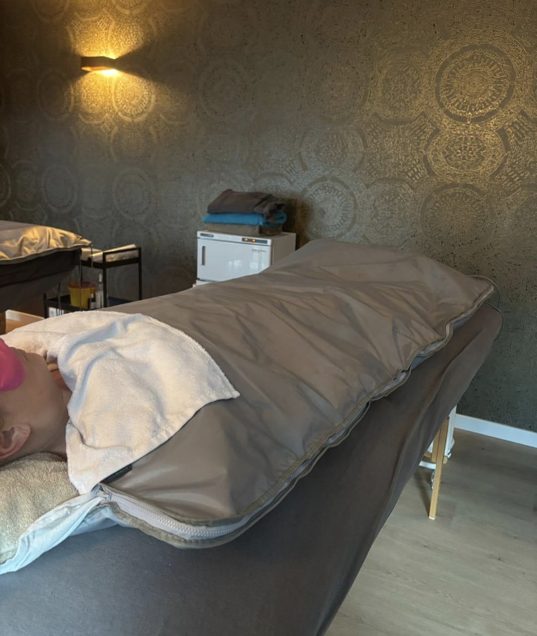 Bij deze volledige lichaamsbehandeling wordt je lichaam gescrubd met magnesium scrub en omhuld in een verzorgende magnesiumgel-pakking. Vervolgens gewikkeld in folie en verwarmd onder een infrarood saunadeken. Het resultaat: diepe ontspanning, soepelere spieren, ontlading van spanning en een voelbare reset van lichaam én hoofd. Helemaal voor jezelf.